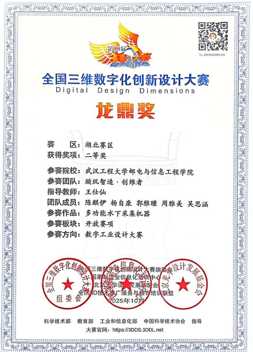 (通讯员 陈麒伊)2025年10月19日,第18届全国三维数字化创新设计大赛(简称“全国3D大赛”)湖北赛区颁奖仪式圆满落幕。我院“璇玑智造·创维者”团队凭借“多功能水下采集机器”项目,在开放赛项中荣获省级二等奖,充分展现了我院在数字化创新人才培养方面的扎实成果。