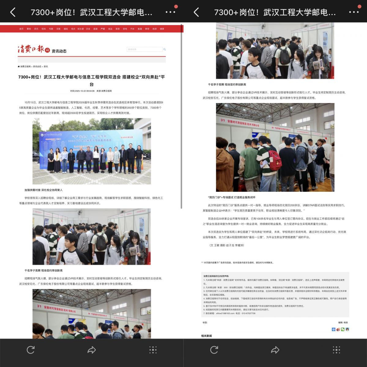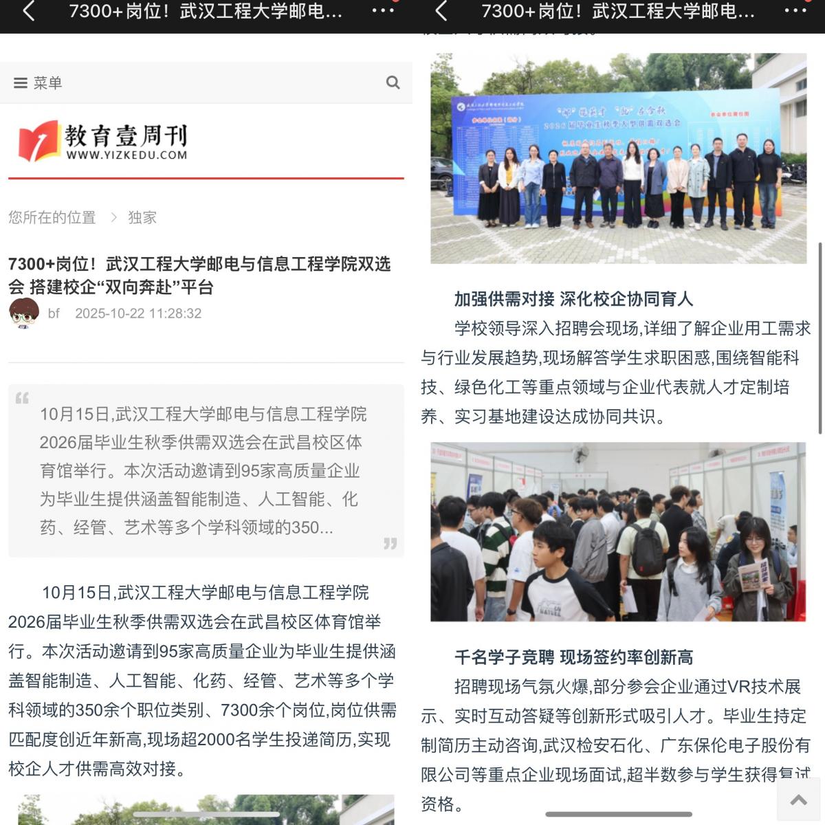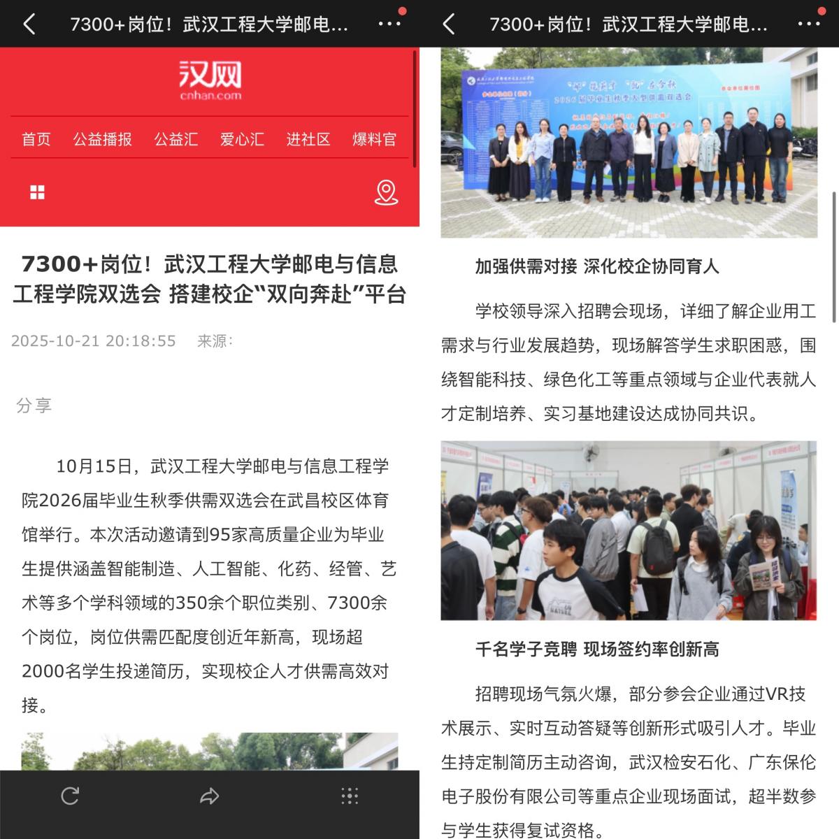 新闻链接:7300+岗位!武汉工程大学邮电与信息工程学院双选会 搭建校企“双向奔赴”平台