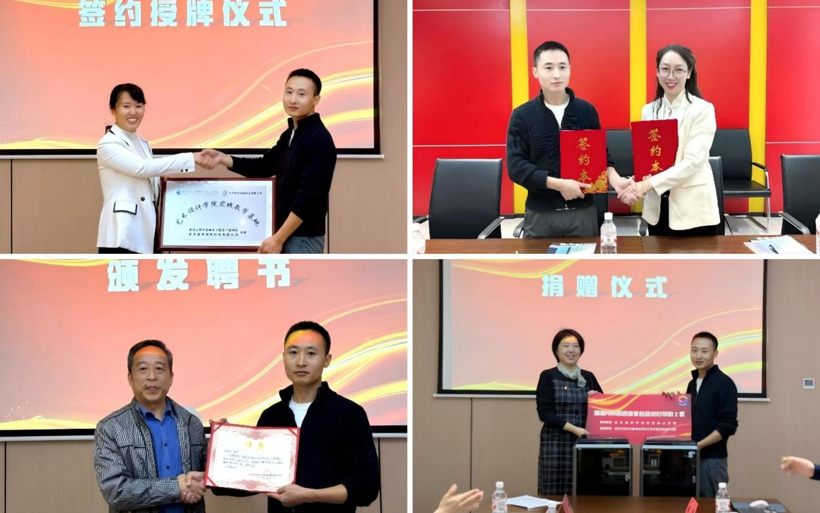 此次活动校企双方隆重举行了合作签约、实践教学基地挂牌、企业导师聘任及设备捐赠四项重要仪式,其中合作协议签署标志着艺术设计学院“创想三维实践教学基地”正式落地。企业负责人陈起星获聘为我院企业导师,将直接参与人才培养方案制定与实践课程教学。此外,创想三维科技有限公司向学院捐赠了FDM高精度全自动3D打印机、专业设计软件等教学设备,为实践教学注入了强劲资源活力,校企合作搭建起了坚实桥梁。