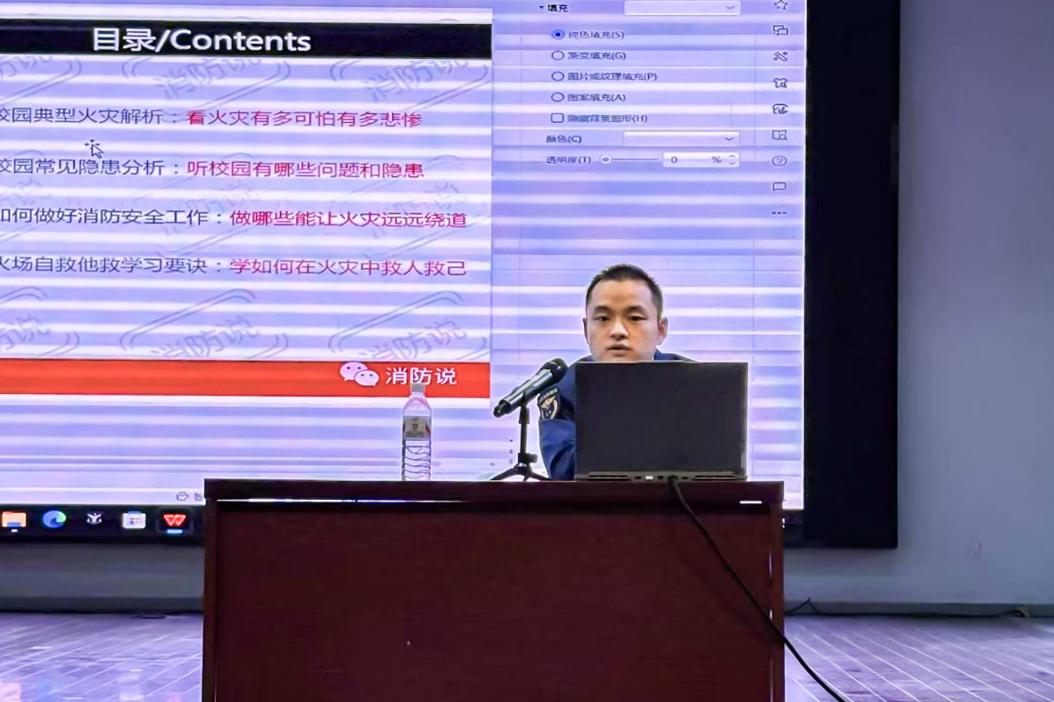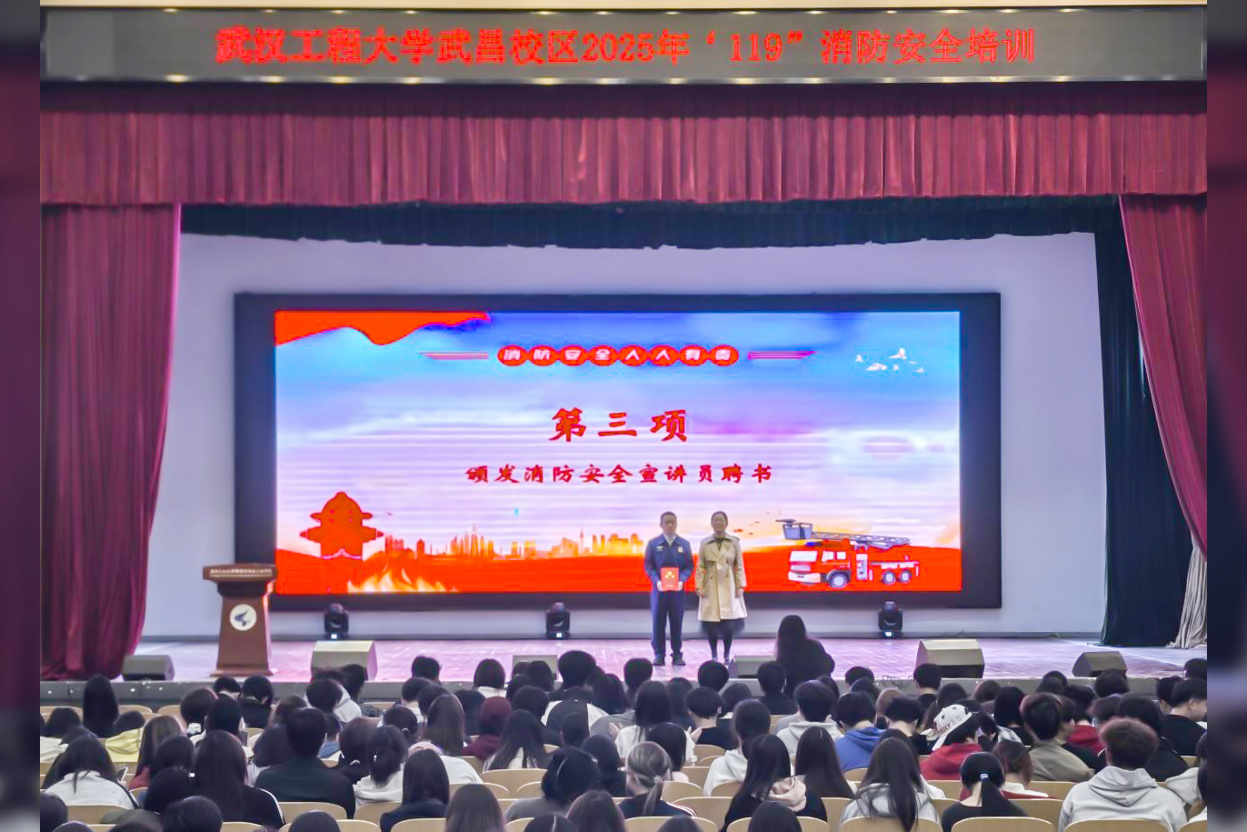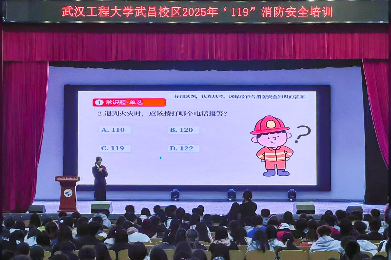(通讯员 汤颖枫)11月5日下午,由校保卫处与学生工作部联合主办、艺术设计学院承办的2025年“119”消防安全培训活动在武昌校区大礼堂圆满举行。活动由艺术设计学院的颜熙同学担任主持人,特别邀请了武汉东湖新技术开发区关山消防救援站副站长罗晨息担任主讲嘉宾,武昌校区的学生们积极参与此次活动。本次活动精心设计了“消防知识宣讲”与“趣味问答”两大环节,为同学们呈现了一堂既实用又生动的消防安全必修课。