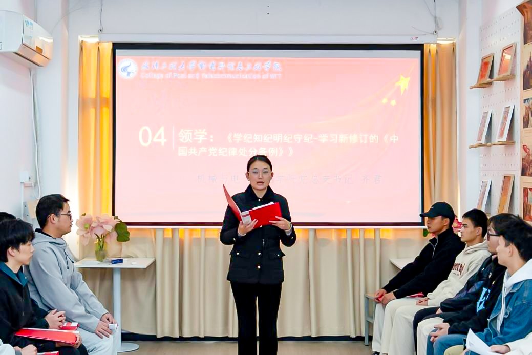 机械与电气工程学院党总支书记齐君以《学纪、知纪、明纪、守纪》为题开展领学。她围绕新修订的《中国共产党纪律处分条例》,系统解读其修订背景、核心要义与重点内容,结合案例引导师生党员深刻把握《条例》精神实质与实践要求,号召大家将党规党纪内化于心、外化于行,筑牢思想防线,永葆先进纯洁,为学院发展提供坚实纪律保障。