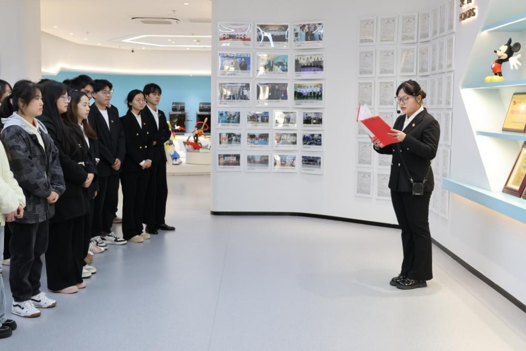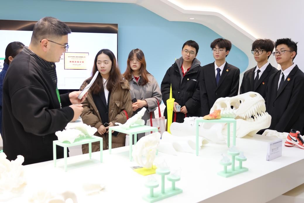 在企业工作人员引导下,全体学生前往公司核心技术展览区进行实地参观,深入了解了公司各类3D打印机的研发原理、应用场景以及技术优势。从工业级3D打印机到桌面级创新设备,企业所展示的“全链条3D打印解决方案”,使师生能够直观地感受到“中国制造”向“中国智造”转型所蕴含的强大动力。