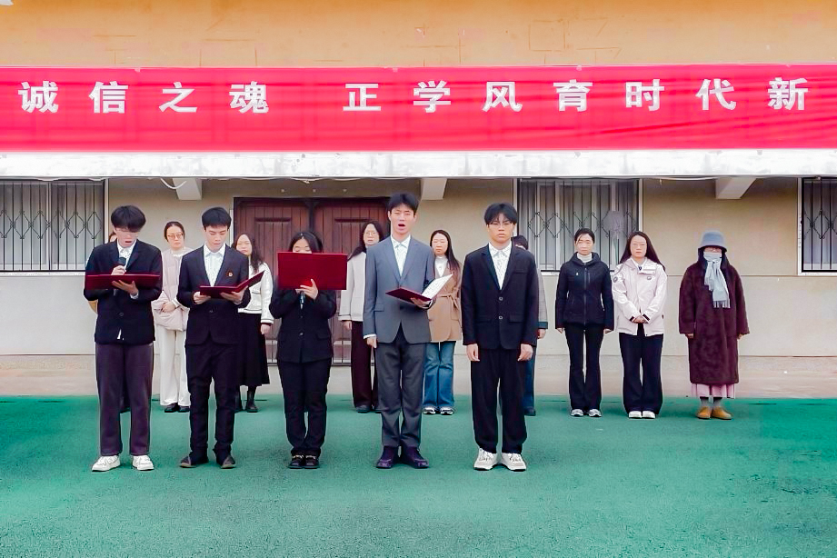 预备党员张彬同学领誓《诚信宣言》。他号召同学们以诚待人、以信立身,自觉规范言行,做守信有责的新时代大学生。