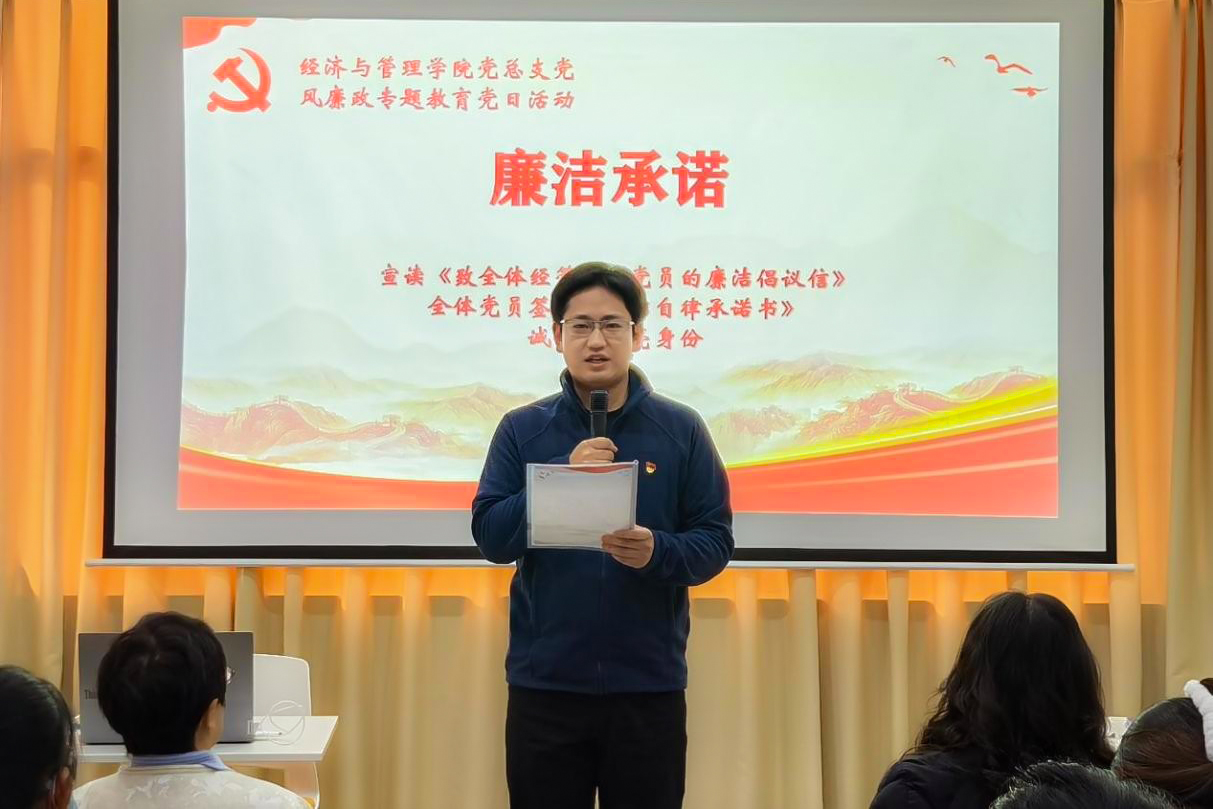 第三党支部学生党员代表邓龙彬宣读《致全体经管青年党员的廉洁倡议书》,号召全体青年党员永葆廉洁初心、严守纪律底线。