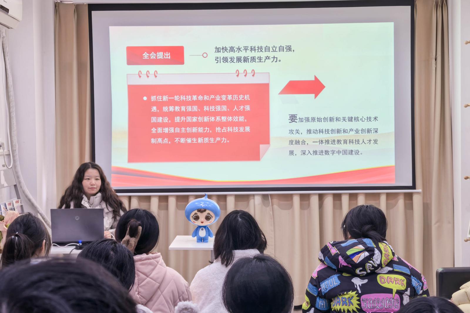 艺术设计学院党总支副书记汤颖枫以微党课形式,带领党员深入学习党的二十届四中全会精神。本次党课特别设置了“邮小信”助讲环节。这位“助讲”不仅向党员们解读党的二十届四中全会精神,还通过一问一答对话环节,引发了在场党员的浓厚兴趣与热烈讨论。