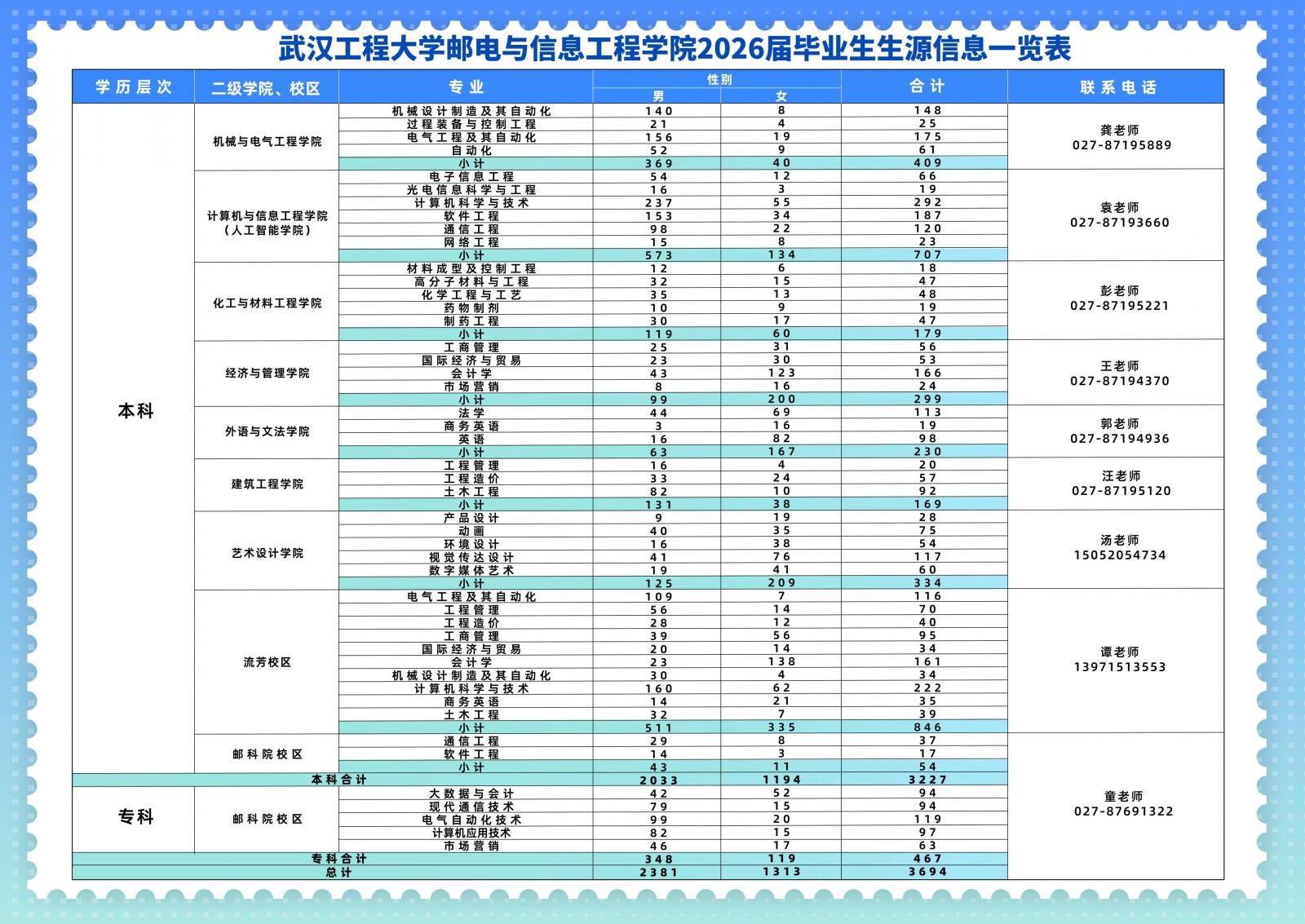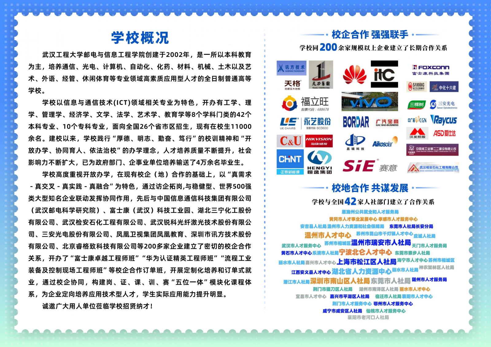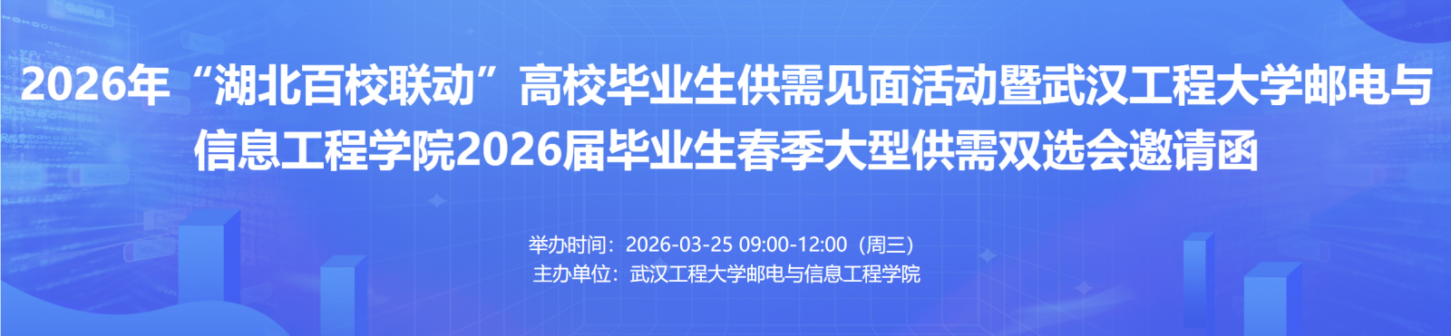 根据学院教学安排,2026年寒假时间为1月19日至2月28日,3月1日正式开学。为充分搭建用人单位和毕业生交流平台,促进毕业生更充分更高质量就业,积极稳妥组织好校园招聘活动,我校定于2026年3月25日举办2026年“湖北百校联动”高校毕业生供需见面活动暨武汉工程大学邮电与信息工程学院春季专场招聘会。在此,我们诚挚邀请各用人单位入校广纳贤才。现将招聘会有关事项说明如下: