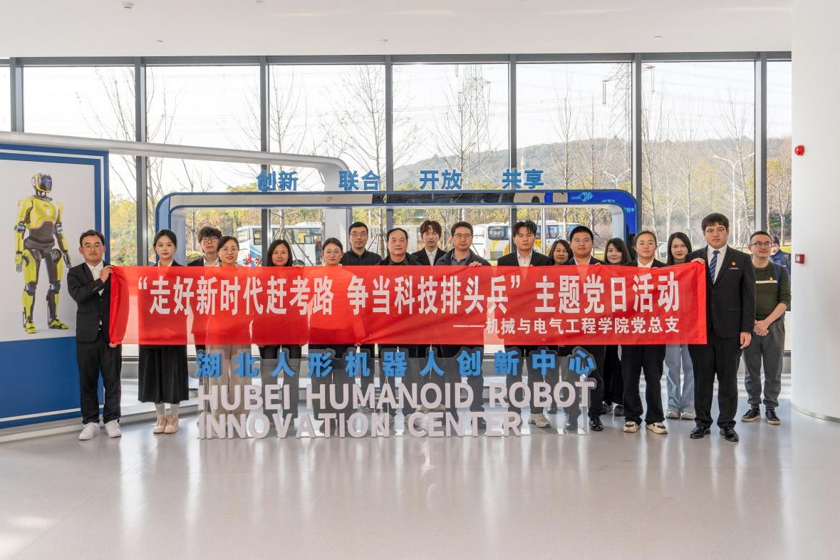 为深入学习贯彻党的二十届四中全会精神,推动“加快高水平科技自立自强”战略部署在基层落地生根,3月11日下午,武汉工程大学邮电与信息工程学院机械与电气工程学院第一、第三、第四党支部师生党员代表走进湖北人形机器人创新中心,开展“走好新时代赶考路 争当科技排头兵”主题党日活动。活动紧扣“十五五”规划蓝图与新质生产力发展要求,通过“理论铸魂、宣讲凝心、实践赋能”三维联动,将组织生活延伸到科技攻关最前沿,引导师生党员在“制”与“智”的时代对话中感悟使命担当,以高质量党建引领书写“智”造未来的奋进答卷。