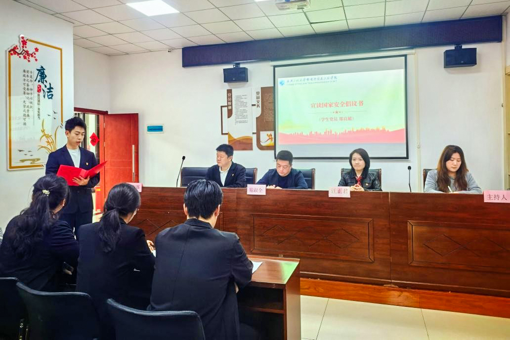 学生党员郑良旭宣读国家安全倡议书,号召全体党员主动担当、积极践行,争做国家安全的坚定守护者。